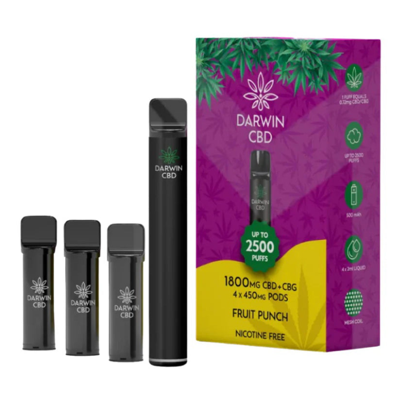 The Darwin device has no buttons and is simply draw activated, and the vape kit itself comes with 4 x 2ml Prefilled Pods each consisting of a 450mg CBD+CBG blend of premium e-Liquid.