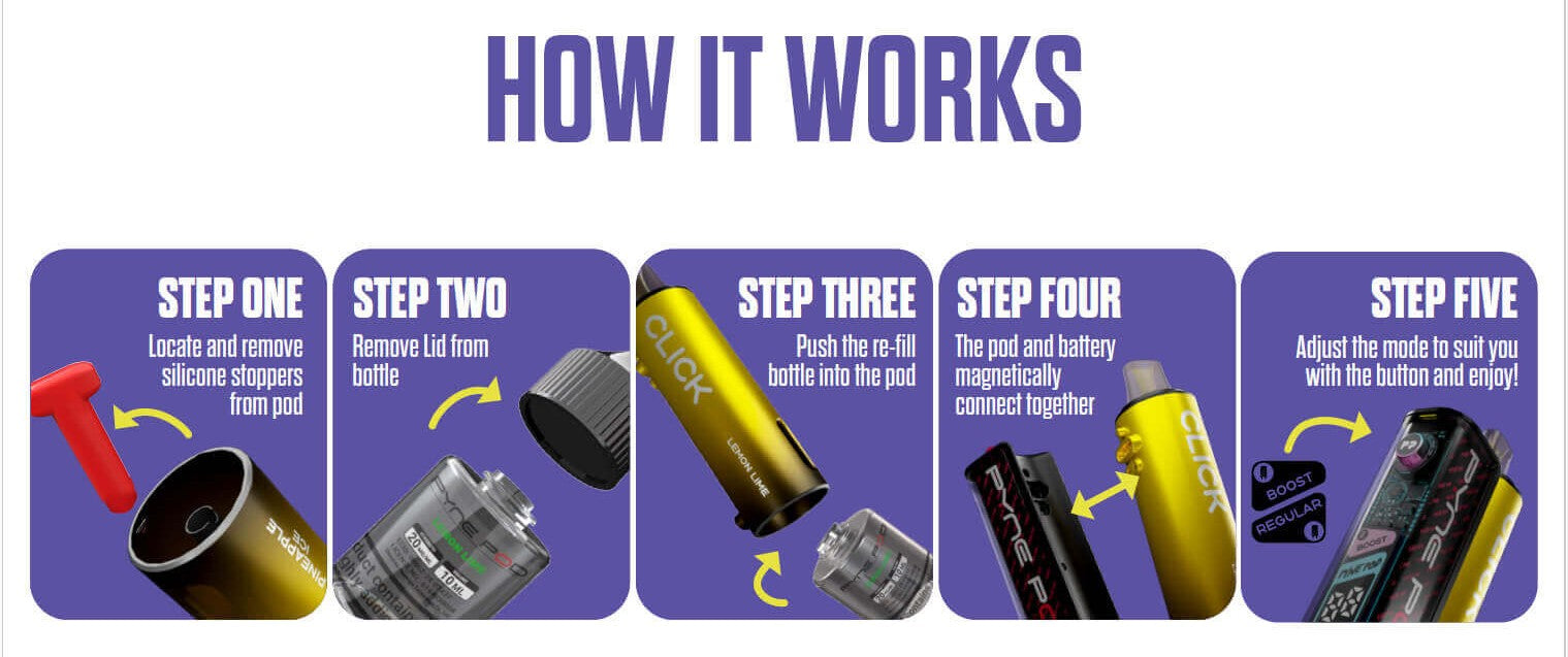 The Pyne Pod Click 50K uses a magnetic click-to-connect pod system. Each kit comes with three 2ml prefilled pods and three 10ml auto-refill containers. The device holds one pod at a time - when you want to change flavours simply remove the current pod and click a fresh one into place. The magnetic connection makes swapping quick and secure!