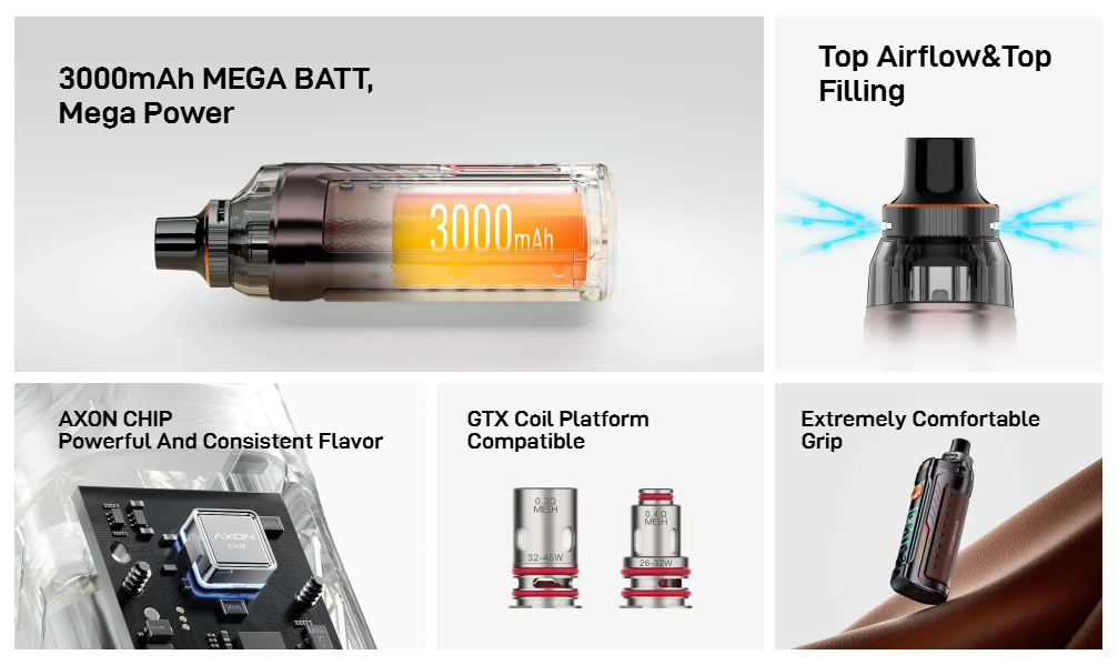 Vaporesso’s AXON Chipset recognises the resistance of the GTX coil you’re using and automatically adjusts the power output of your Armour G to match the optimal wattage to suit it, helping to prevent dry hits and improve coil life.