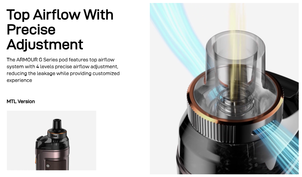 With the Armour G you’re in control of every inhale. The top airflow system includes four adjustable levels, giving you the flexibility to switch from tight MTL draws to open DTL clouds.