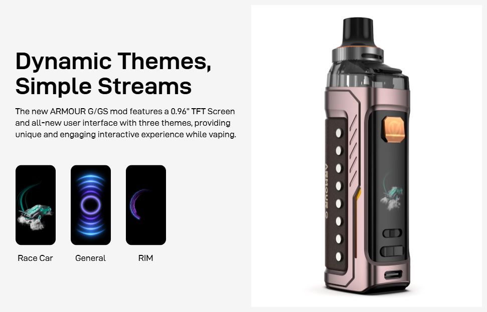 The Armour G vape kit keeps everything clear with its 0.96” TFT colour display. Easily adjust settings, check your battery level, and enjoy dynamic on-screen animations that bring the device to life.
