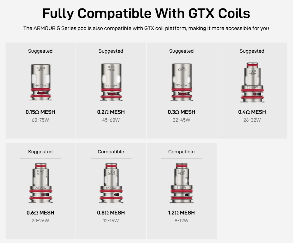 The Vaporesso Armour G pod kit uses the GTX series of mesh coils for consistent flavour and vapour. The kit includes a 0.2Ω coil for big DTL clouds and a 0.4Ω coil for a more restricted RDL draw. You’ll also have access to the full GTX coil range for even more customisation!