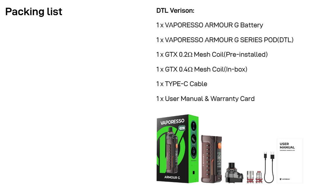 The Vaporesso Armour G Pod Kit packs powerful performance and durability into a compact, user-friendly design. The Armour G is powered by a high-capacity 3000mAh built in battery that keeps you vaping for longer on a single charge. Whether you enjoy tight MTL pulls or big DTL clouds, you’ll get full control with adjustable airflow and up to 80W of adjustable power. The Vaporesso Armour G is compatible with the Armour G Pods and GTX Coils, which bring out the bold flavour and dense vapour. The Armour G gives you more control over every vape with features like Smart Mode to optimise your settings, Pulse Mode for better flavour, and Eco Mode to stretch your battery life. Plus fast USB-C charging keeps your device ready to go with less waiting around.