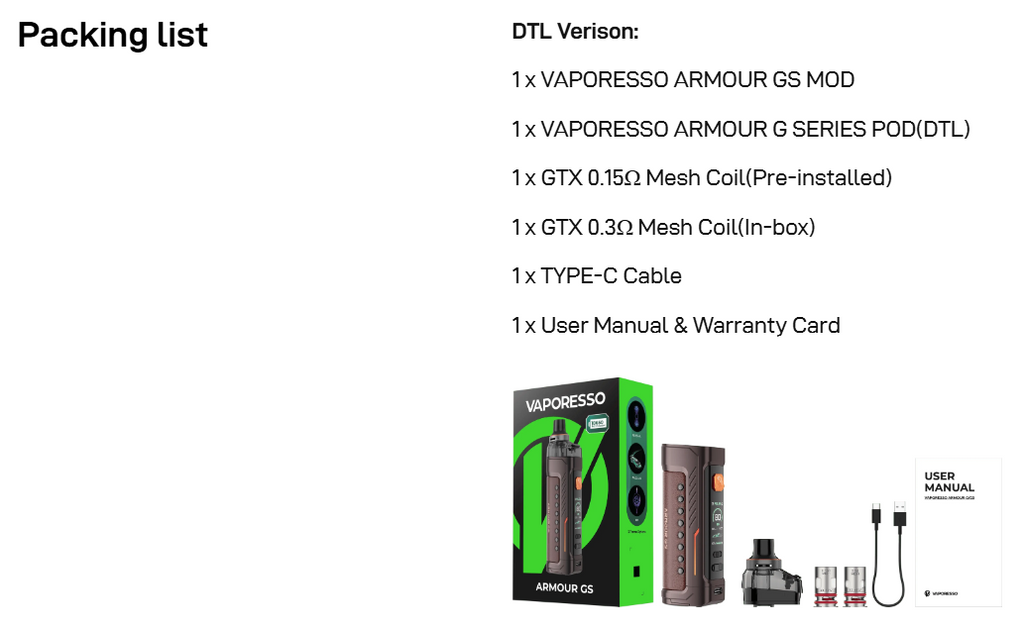 The Vaporesso Armour GS pod kit uses the GTX series of mesh coils for consistent flavour and vapour. The kit includes a 0.15Ω coil for big DTL clouds and a 0.3Ω coil for a more mellow DTL draw. You’ll also have access to the full GTX coil range for even more customisation!